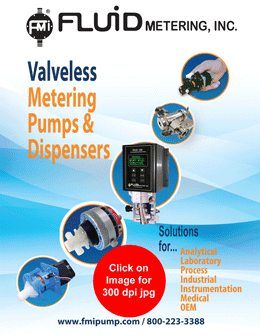 For 55 years, Fluid Metering has been providing their valveless, ceramic piston pump design for precision fluid control in Laboratory, Process, and Industrial applications. In addition, FMI's miniature OEM pumps have proven a good choice for micro-volume fluid control in analytical, medical, and process analyzers and instrumentation. FMI's newly released 2014 Full Line Catalog contains new products as well as expanded flow and configuration information. Fluid Metering's new 2014 Catalog is available on their web site www.fmipump.com in PDF format for immediate download.