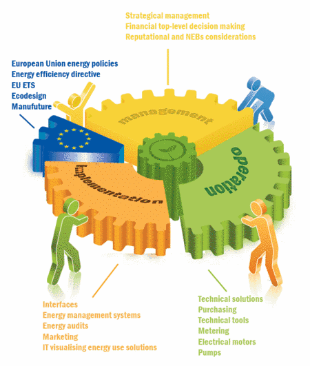 Nationally, as a part of energy management, guidelines are laid out for the organization of efficiency activities, energy control, energy-effective purchasing, training and motivation of staff. They outline ways for companies