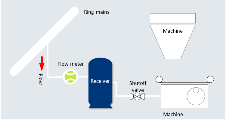 In some cases, a decentralized receiver tank is used to “shave off” the peak load on the network. A question often asked: where to place the flow meter, and what will the flow meter show us when the machine has been turned off. This part of the article is based on an older audit at a potato food processing plant, where we used a standard thermal mass flow meter without bi-directional sensitivity. The auditor called us after a couple of days, to discuss the results. The flow meter showed significant consumption while the machine was isolated from the network. The receiver tank was simply acting as a local buffer for machines further downstream the line. It was filled, and emptied at the pace of their consumption, causing significant readings on the thermal mass flow meter. In this case, the issue was finally resolved by ignoring the data during the period when the machine was shut off.
