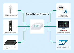 These components are simply installed according to the supplied wiring diagram and connected to the network. As soon as the power is switched on, the system configures itself. The vibration sensor transmits its measured values to the IO-Link master, which forwards them to the Box Thin Client BTC22 for pre-processing and aggregation. This fanless computer also acts as an edge gateway and is designed for robust industrial use.